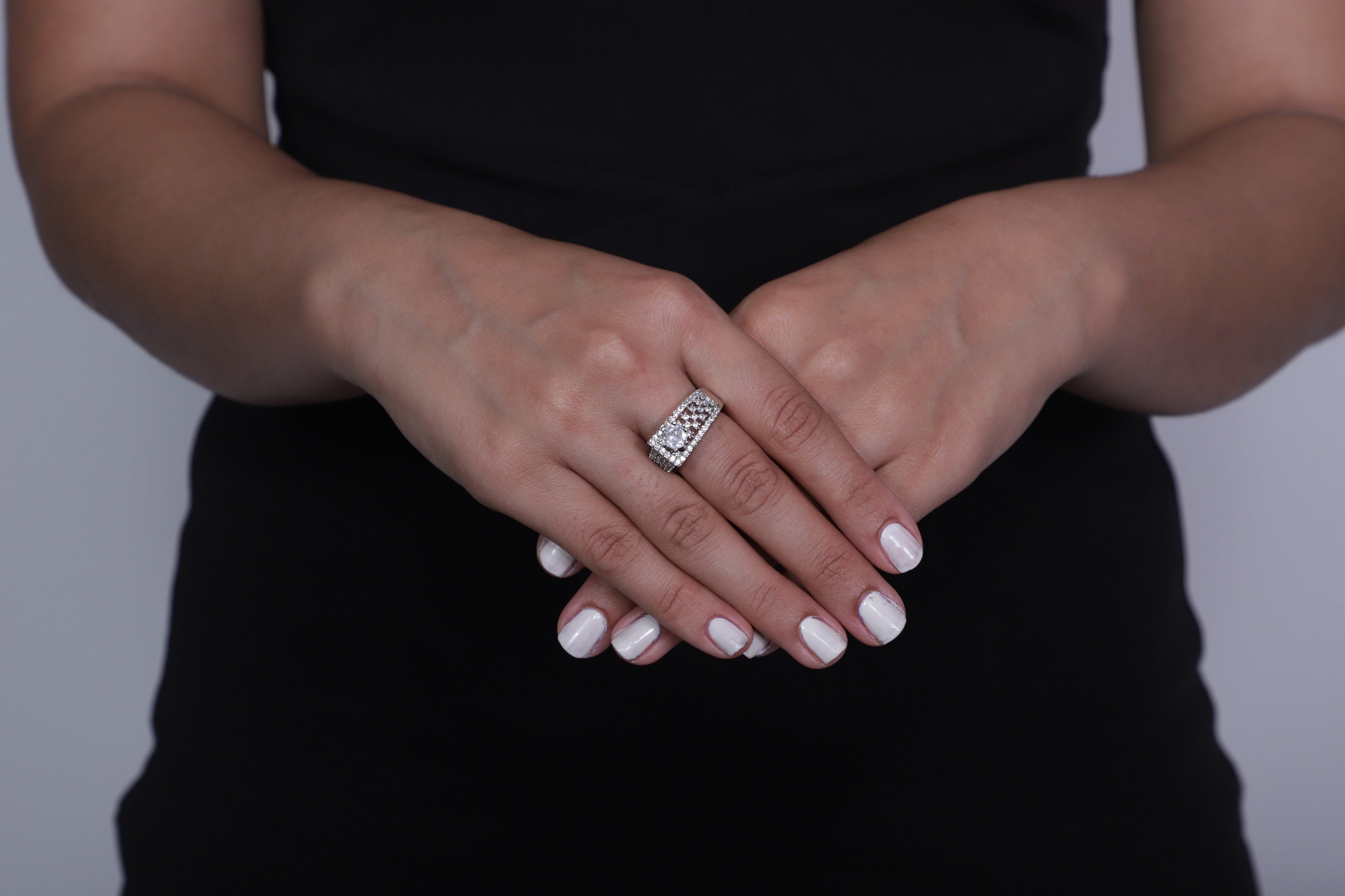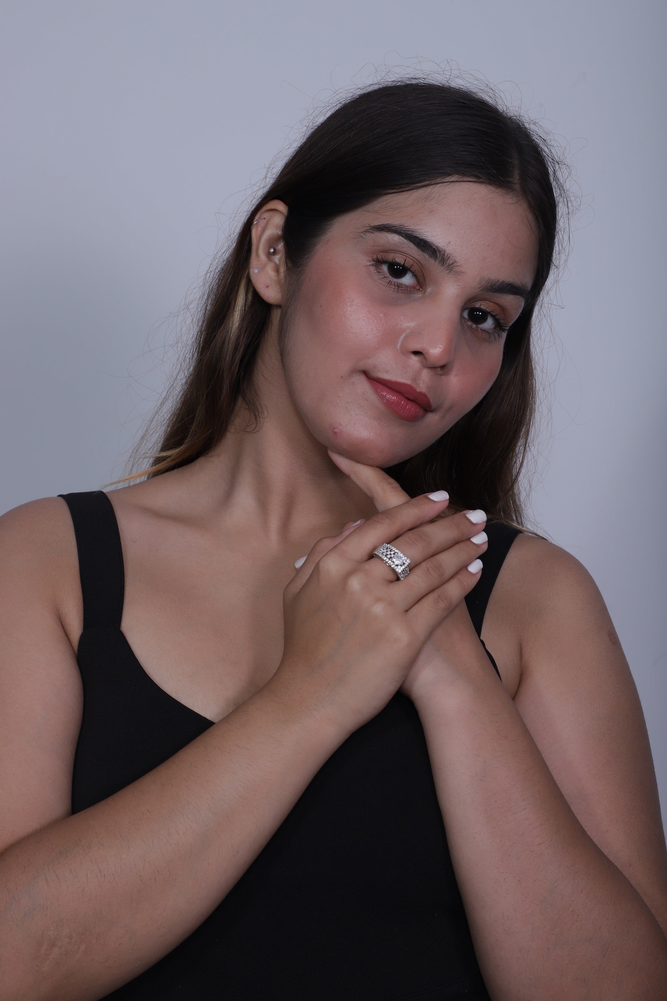 Elevate your elegance with the Viora Rhodium-Plated American Diamond Ring. This exquisite piece showcases a dazzling array of American diamonds, set in a sleek and sophisticated rhodium-plated band. The adjustable design ensures a perfect fit for any finger, making it a versatile addition to your jewelry collection. Whether for a special occasion or everyday glamour, this ring promises timeless beauty and effortless style. Treat yourself or a loved one to a touch of luxury with Viora.